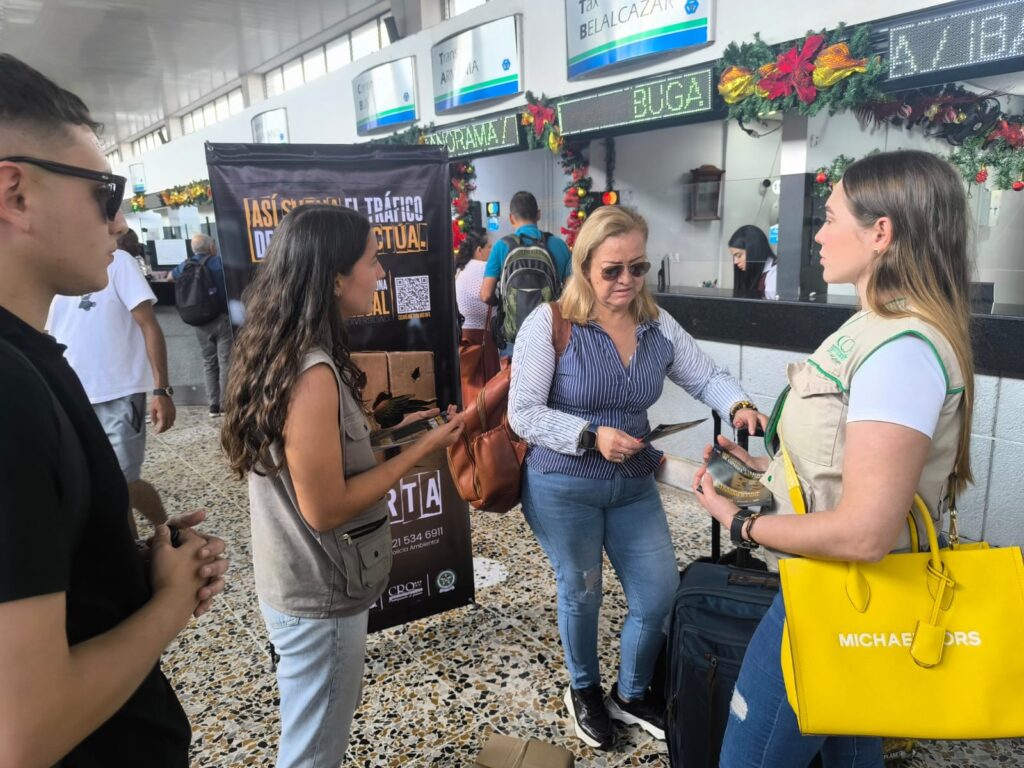En este contexto, la autoridad ambiental lanzó la campaña ‘Así Suena El Tráfico de Especies, Actúa’, una iniciativa innovadora que incluye un experimento social realizado en la Terminal de Transportes de Armenia, uno de los principales puntos de tránsito asociados a este delito. Durante la actividad, un actor simula ser un presunto traficante y deja una caja a cargo de un ciudadano. A través de sonidos, movimientos y elementos visuales, se recrea la presencia de un animal silvestre en cautiverio, generando reacciones y reflexión entre los participantes.